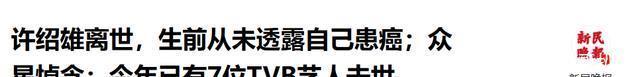 为了避免过多占用外界的资源,吴博君的遗孀表示相关的追悼会举办完毕后,才把这个消息透露给外界,让人唏嘘! 10月:许绍雄抗癌失败,众星悼念 就在今天,再传TVB艺人离世的噩耗! 陪伴观众50余年的“黄金绿叶”许绍雄因癌症离世,引发全圈悼念。