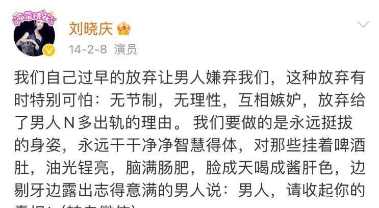 不仅如此,刘晓庆还揭露了许多男性身上的恶习与缺点,十分尖利的让部分男人收起他们的蠢相。这样的发言其实很容易使一个公众人物受到大众的攻击,但刘晓庆快人快语将自己的思想表达出来,没有藏头露尾,也没有丝毫畏惧。